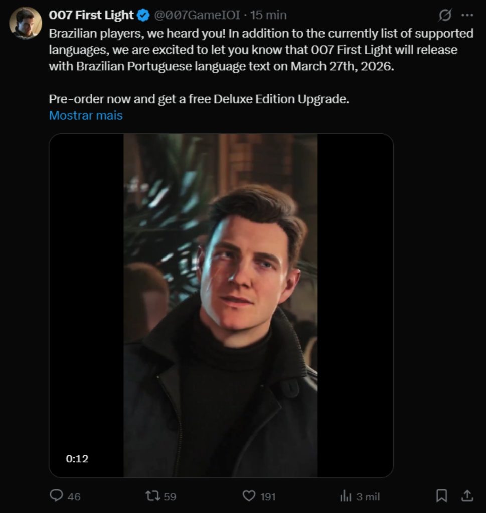 Jogadores brasileiros, ouvimos vocês! Além da lista atual de idiomas suportados, temos o prazer de informar que 007: First Light será lançado com texto em português do Brasil em 27 de março de 2026.