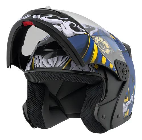 O modelo vem com viseira cristal e colorida, oferecendo versatilidade para diferentes condições de luz. A forração interna é feita de tecido antialérgico e antibacteriano, removível e lavável, facilitando a manutenção. Além disso, o capacete possui bavete para bloquear a entrada de ar e melhorar a acústica, juntamente com entradas de ar frontais e superiores para ventilação eficiente.