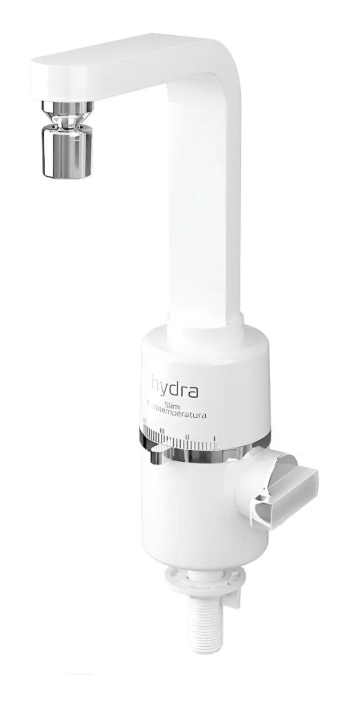 A Hydra Moderna Slim é uma opção compacta para quem busca praticidade sem abrir mão do aquecimento rápido. Com potência de 5.500 W e quatro níveis de temperatura, o modelo permite ajustar facilmente o ponto ideal da água. A estrutura em termoplástico mantém o visual simples e leve, enquanto o registro cerâmico ajuda a evitar vazamentos. Já a bica móvel com arejador articulável facilita alcançar toda a área da cuba, tornando a lavagem mais prática.