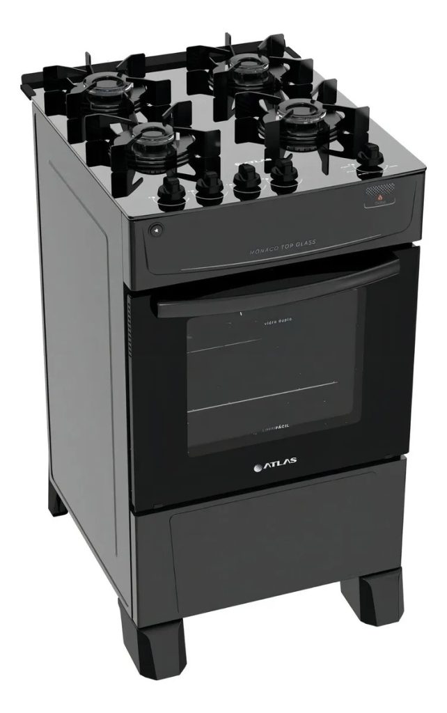 O Atlas Mônaco Top Glass é uma opção interessante para quem busca um fogão 4 bocas com mesa de vidro barato e prático para a rotina da cozinha. O modelo foi pensado para uso frequente, trazendo trempes individuais de aço esmaltado que ajudam a manter as panelas centralizadas e mais estáveis durante o preparo.
