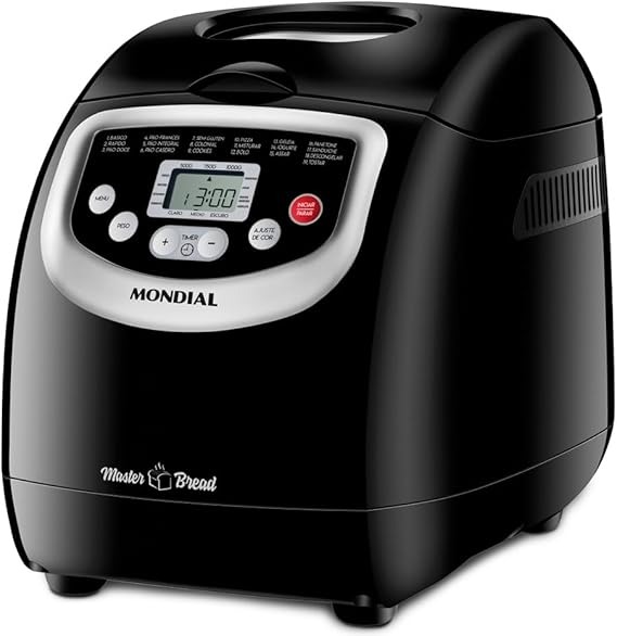 Além disso, o painel digital ajuda na hora de ajustar o tamanho do pão, que pode ser de 500 g, 700 g ou 1 kg. Também é possível programar o início do preparo com antecedência e escolher o nível de dourado da crosta entre claro, médio ou escuro. Outro ponto positivo é que a Mondial envia o modelo com copo medidor e colher dosadora, o que deixa todo o processo mais organizado e fácil para quem está começando.