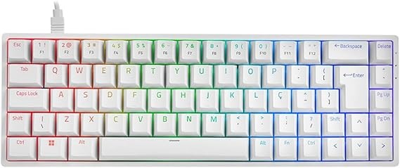 O modelo conta com iluminação no padrão rainbow, que distribui cores fixas pelas teclas e adiciona um visual mais chamativo ao setup. Além disso, as keycaps utilizam tecnologia Double Shot Injection, garantindo legendas mais resistentes ao desgaste e melhor sensação ao toque. Isso contribui para uma vida útil maior, mesmo com uso frequente.