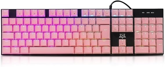 O Adamantiun Shuriken T10D é indicado para quem prefere um teclado mecânico completo e com visual marcante. Com 107 teclas, ele oferece layout ABNT2 e espaço de sobra para quem utiliza funções adicionais no dia a dia ou em jogos. O design combina tons de rosa e preto com detalhes em branco, criando um estilo diferente dentro da categoria custo-benefício.