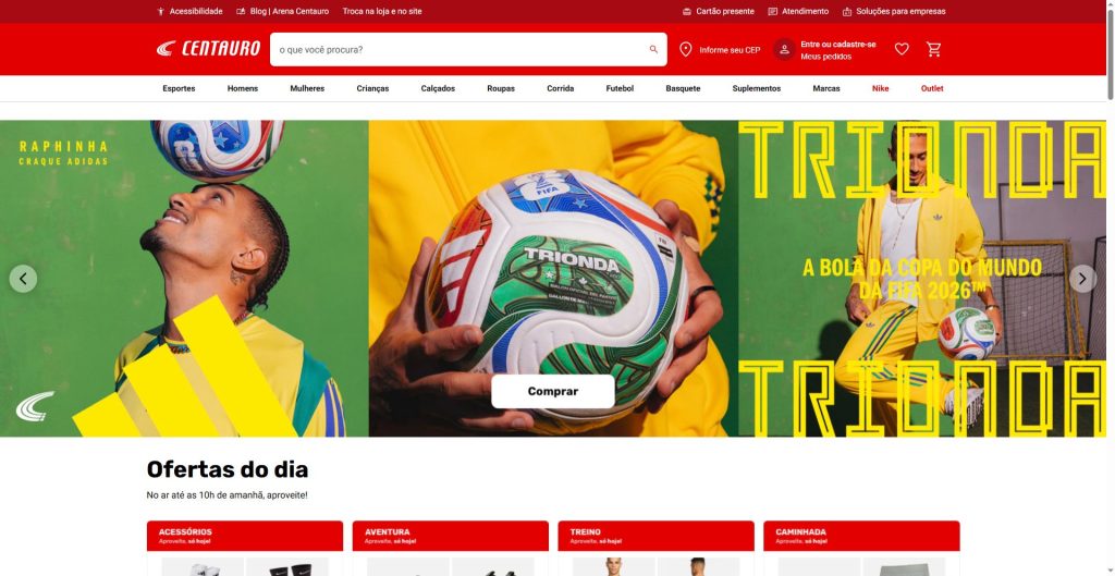 A Centauro é uma das maiores redes de artigos esportivos do Brasil e também se destaca no e-commerce. Seu catálogo de camisetas de futebol reúne produtos de marcas renomadas e times de destaque, atendendo torcedores de todos os perfis.