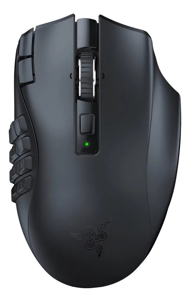 O Razer Naga V2 é uma ótima escolha para quem precisa de muitas macros e quer aproveitar a liberdade da conexão sem fio. Mesmo sendo um modelo robusto, ele continua leve, com cerca de 95 g, o que ajuda bastante durante longas sessões de MMORPG. Seu grande diferencial está na quantidade de comandos disponíveis, já que ele oferece de 19 a 21 botões programáveis organizados para facilitar rotações de habilidades.