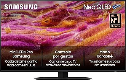A Samsung Neo QLED QN90F é uma das opções mais completas entre as TVs de 43 polegadas. Ela é indicada principalmente para quem busca alto desempenho em jogos e excelente qualidade de imagem. Com tecnologia QLED e suporte a HDR10+, o modelo entrega cores mais vivas, alto nível de brilho e ótima definição de detalhes. Isso se mantém tanto em cenas escuras quanto em ambientes muito iluminados.