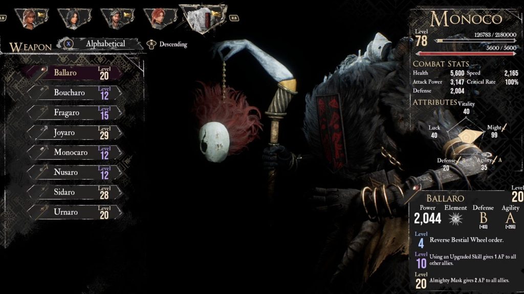 Ballaro transforma Monoco em um personagem mais voltado ao apoio do grupo. Suas vantagens giram em torno de geração de PA para aliados, especialmente ao usar habilidades com a Máscara Todo-Poderosa.