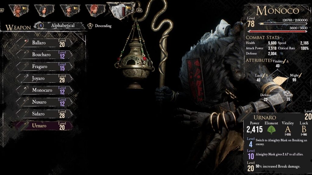 Urnaro facilita o acesso à Máscara Todo-Poderosa ao derrotar inimigos e aumenta em 50% o dano de quebra no nível máximo. Funciona muito bem em builds focadas na Máscara Pesada, combinadas com Pictos e Luminas voltadas para quebra.