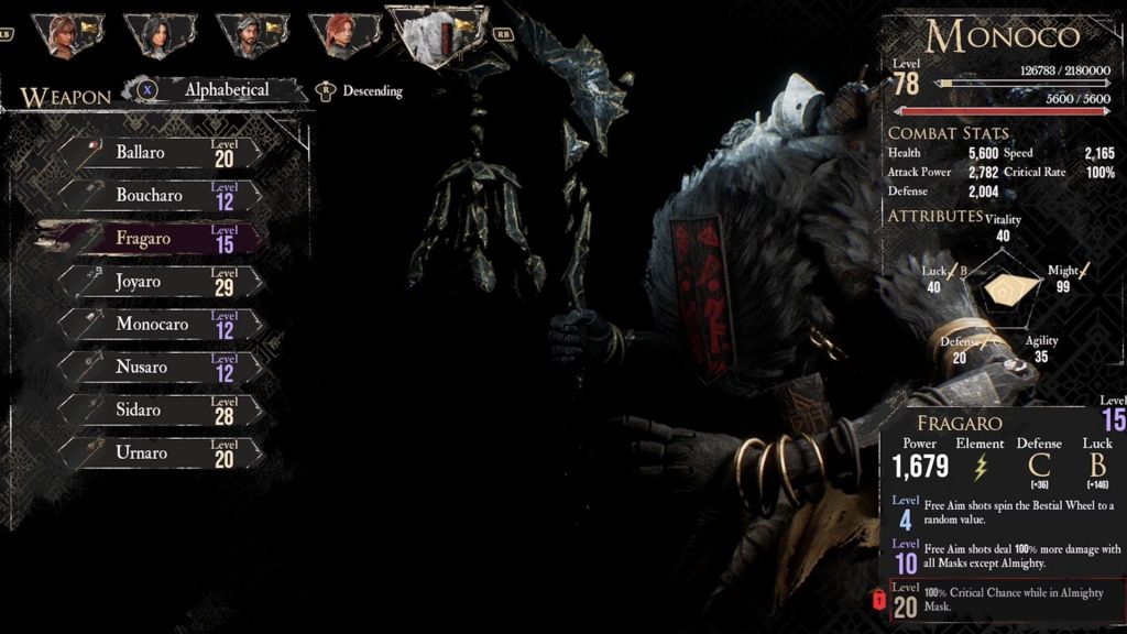 Fragaro é a melhor escolha para quem quer explorar os disparos de Mira Livre de Monoco. Ela oferece alto Poder base, gira a Roda Bestial com tiros e garante 100% de chance de crítico ao alcançar a Máscara Todo-Poderosa.