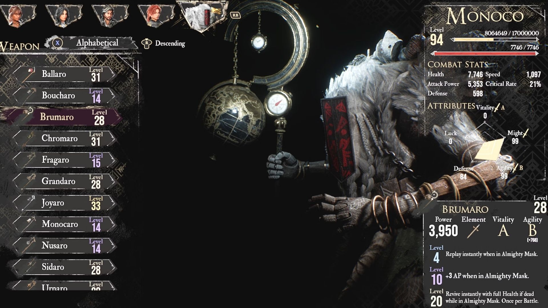 Brumaro se destaca pelas vantagens únicas ligadas à Máscara Todo-Poderosa. Turno extra, PA adicional e até reviver automático tornam essa arma excelente em batalhas longas ou situações de risco.
