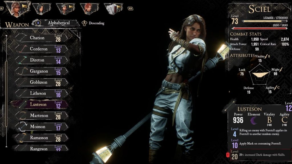 Com dano Sombrio reforçado no nível 20, Lusteson funciona muito bem contra inimigos vulneráveis a Trevas. Por outro lado, perde eficiência contra alvos resistentes, exigindo apoio de Pictos que convertam o tipo de dano.