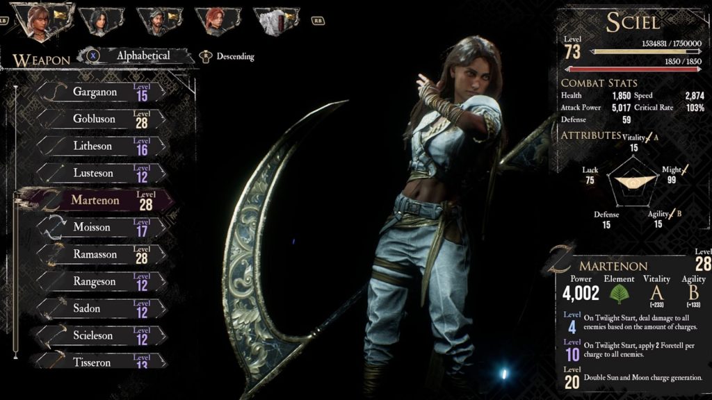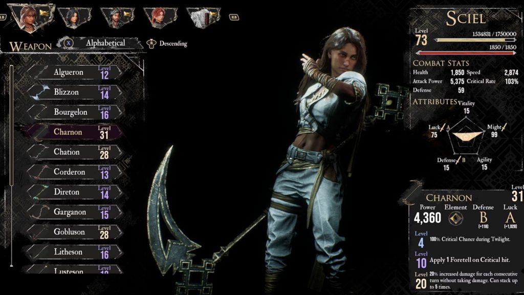 Charnon é única no arsenal de Sciel por utilizar dano de Vazio. Durante o Crepúsculo, todos os ataques são acertos críticos, eliminando a necessidade de investir em Chance Crítica. No nível 20, o dano total aumenta progressivamente a cada turno sem sofrer dano, podendo chegar a +100%.