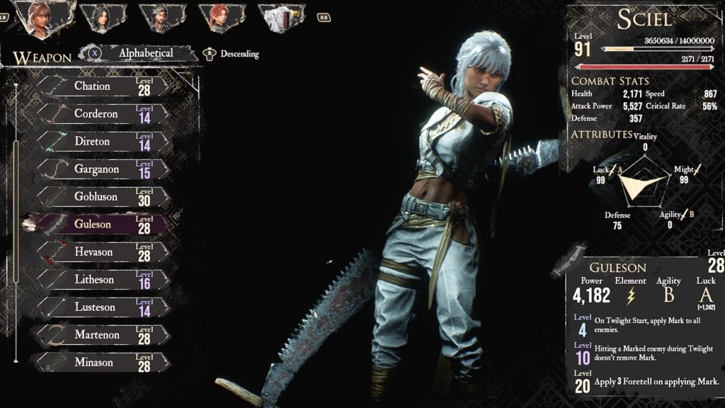 Guleson é uma das armas mais eficientes em termos de sinergia interna. Ao entrar no Crepúsculo, Sciel aplica Marca em todos os inimigos, e no nível 10 essa Marca não é removida ao atacar. O nível 20 fecha o pacote ao aplicar três Profecias junto da Marca.