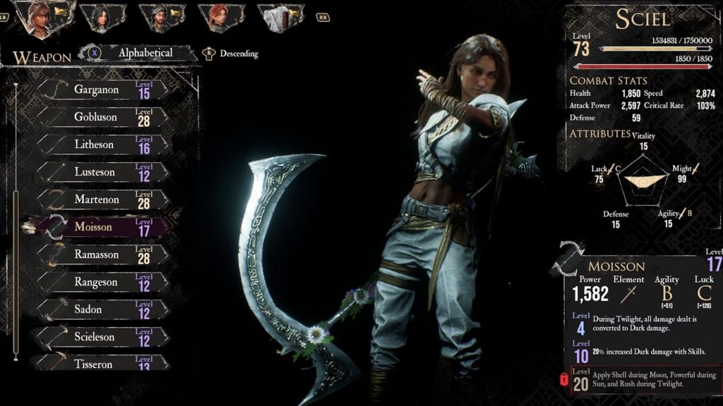 Sciel utiliza foices duplas e possui um dos arsenais mais interessantes do game. São mais de 20 armas diferentes, cada uma com escalonamentos próprios, tipos de dano variados e vantagens que desbloqueiam nos níveis 4, 10 e 20.