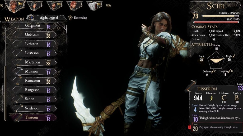Tisseron se destaca pela manipulação do tempo de Crepúsculo. Usar habilidades certas prolonga sua duração, aumenta o dano e, no nível 20, concede um turno extra imediato ao entrar nesse estado.