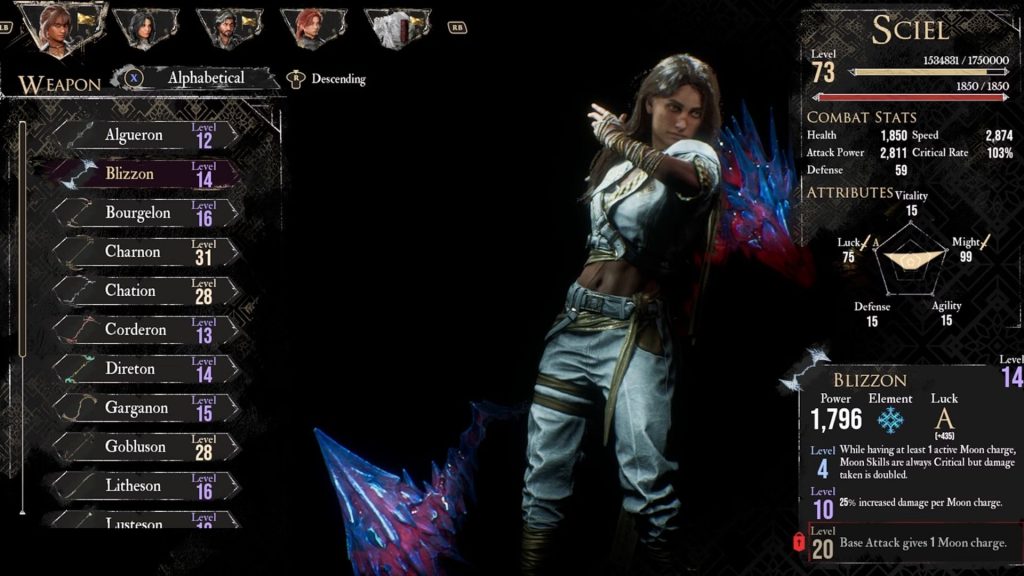 Blizzard é, sem exagero, a arma mais forte de Sciel. Enquanto houver ao menos uma carga de Lua, todas as habilidades lunares são acertos críticos. Em troca, o dano recebido é dobrado, o que transforma cada erro em punição real.
