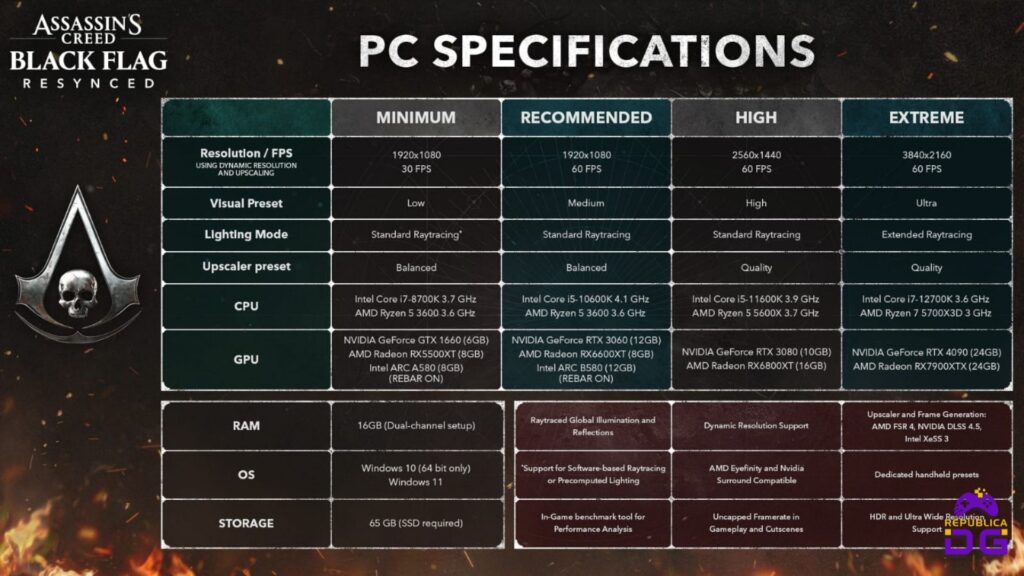 A Ubisoft detalhou os requisitos de Assassin’s Creed Black Flag Resynced para PC, mostrando que o jogo foi pensado para escalar bem entre diferentes configurações — do básico ao mais avançado.