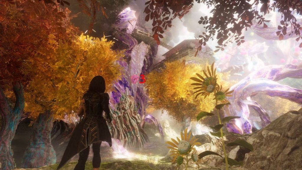 Em seguida, procure o terceiro balão, que fica mais afastado. Ele está localizado na grande árvore roxa, abaixo da casa na árvore.