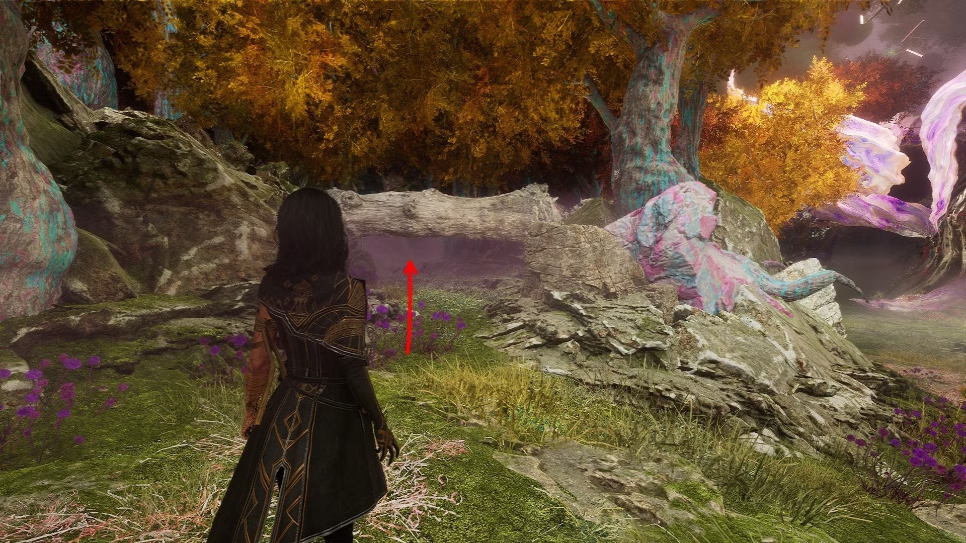 Siga em frente a partir da porta e observe uma rocha grande com um galho caído atrás dela. Passe por baixo desse galho para acessar a área onde está a bolha rosada que envolve a gaiola.