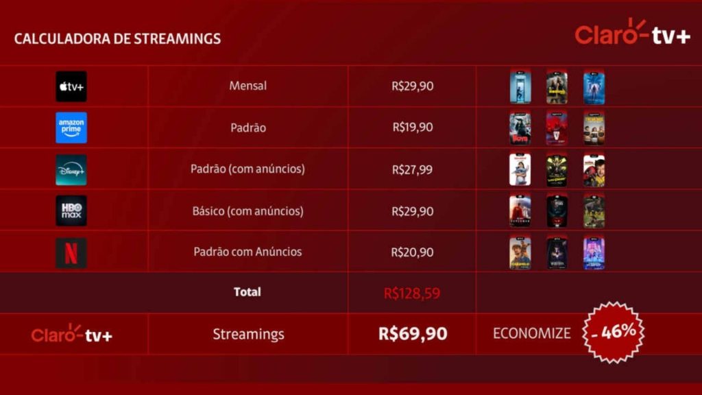 Para TVs conectadas e outros dispositivos, a versão Claro tv+ App tem preços a partir de R$ 99,90. Além disso, a operadora lançou o Claro tv+ Streamings, voltado a clientes de banda larga e móvel.