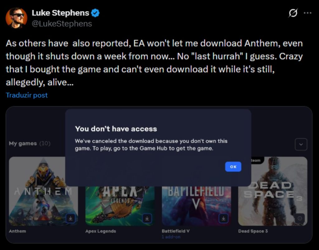 Mesmo quem comprou Anthem digitalmente tem encontrado dificuldades para acessar o jogo em sua semana final. Relatos nas redes sociais indicam que a EA App impede o download do título, exibindo mensagens que afirmam que o usuário “não possui o jogo”, mesmo em contas com edições como a Legion of Dawn registradas no histórico.