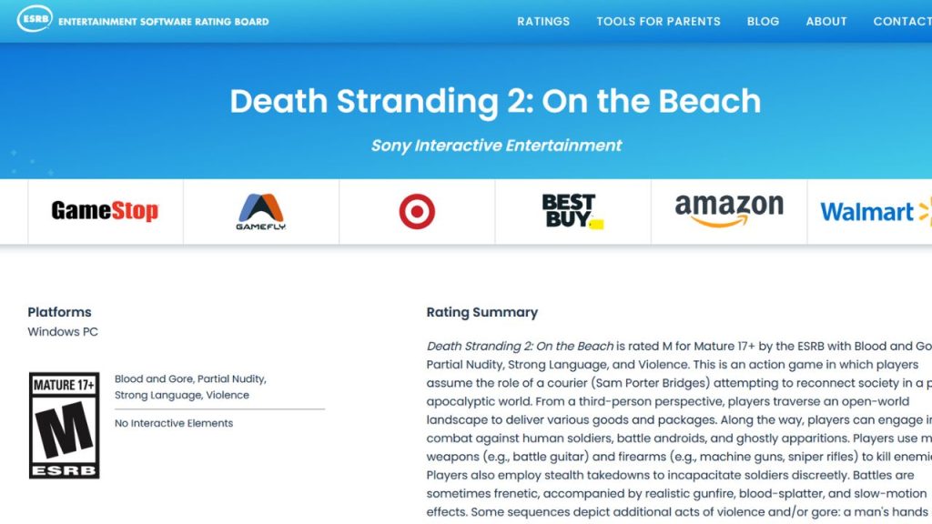 A classificação aponta a Sony Interactive Entertainment será responsável pela versão para PC, diferentemente do primeiro Death Stranding, cuja edição para computadores foi publicada pela 505 Games.