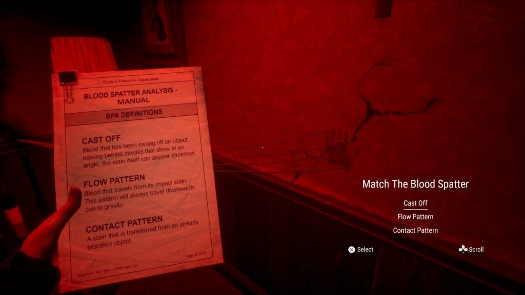 Cada evidência encontrada aciona uma narrativa que explica o processo forense. É algo sombrio e coerente com a atmosfera. Tudo isso acontece enquanto a ameaça continua circulando por perto.