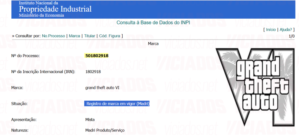 A informação foi identificada por Rafael Vieira, do Portal Viciados, durante a análise de registos públicos do INPI. A atualização foi publicada em 27 de janeiro de 2026 e garante à empresa o direito exclusivo de uso comercial da marca GTA 6 no país.