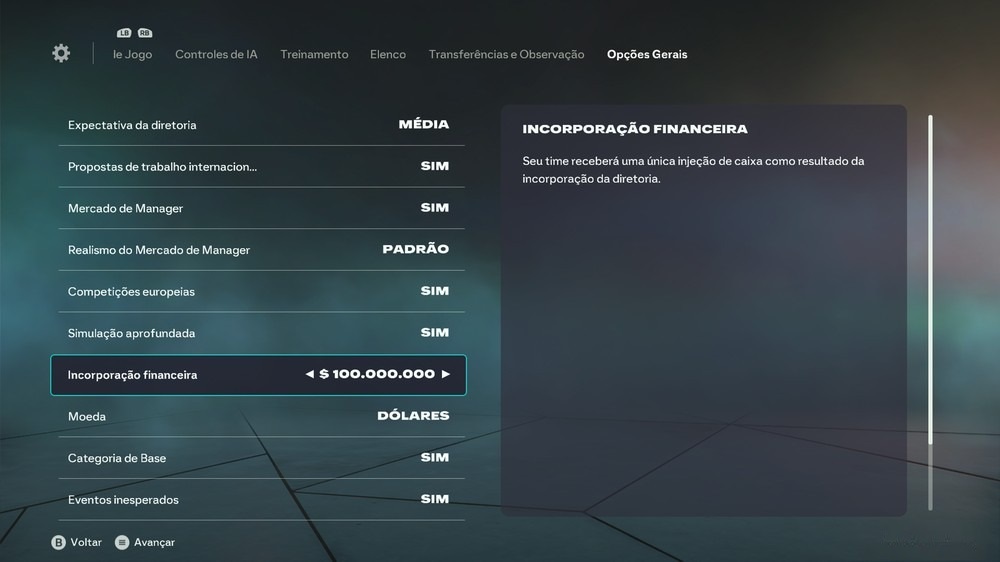 Para ativar esse recurso, crie uma Nova Carreira, escolha o treinador e o clube e, em seguida, acesse as configurações. Dentro de Opções Gerais, selecione Incorporação Financeira e ajuste o valor desejado, que pode variar entre 10, 50, 100, 200 ou até 500 milhões, em euros, reais, dólares ou outras moedas. Dessa forma, você começa a temporada com mais recursos, acelera o crescimento do clube e ganha mais liberdade para tomar decisões estratégicas ao longo do Modo Carreira.