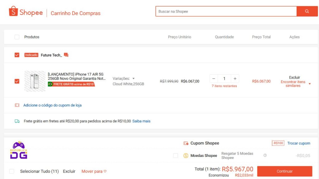 A Shopee renovou seus cupons do 11/11, permitindo adquirir o recém-lançado iPhone 17 Air por R$ 5.967,00 em até 12 vezes sem juros.
