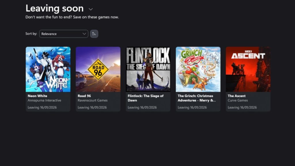 Entre os destaques que se despedem do catálogo estão Road 96, The Ascent e Flintlock: The Siege of Dawn, lançado em 2024. A lista também inclui Neon White e The Grinch: Christmas Adventures.