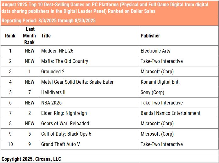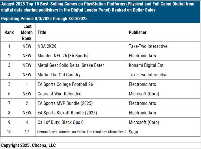 Logo atrás, vieram Madden NFL 26, Mafia: The Old Country, Metal Gear Solid Delta: Snake Eater e Gears of War: Reloaded, que completaram o top 6.