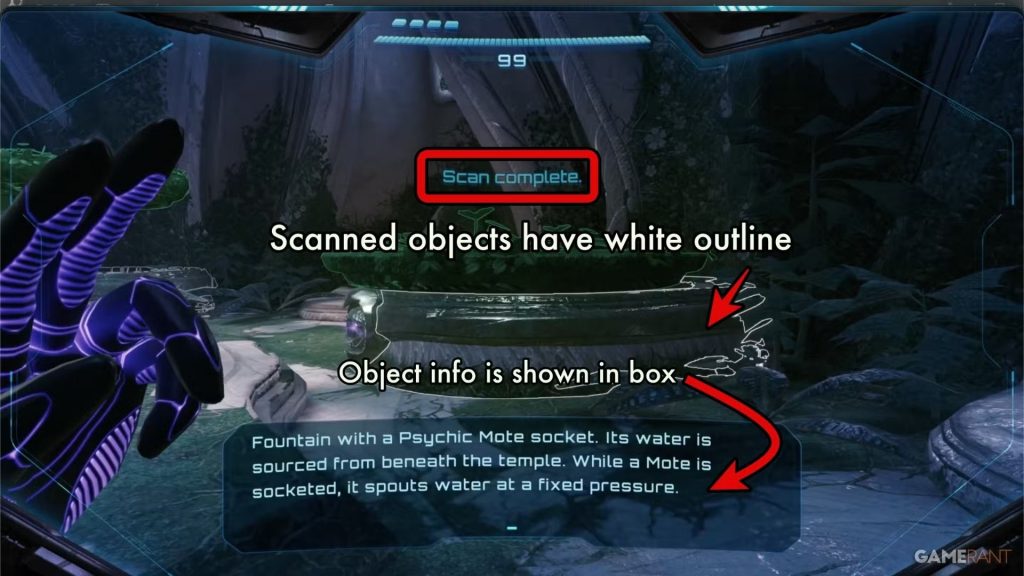 Para escanear, mire no objeto com o ZL e mantenha pressionado até a barra de progresso completar. Portanto, muitos elementos trazem informações essenciais, como fraquezas de inimigos, detalhes do mundo e instruções sobre portas e travas.