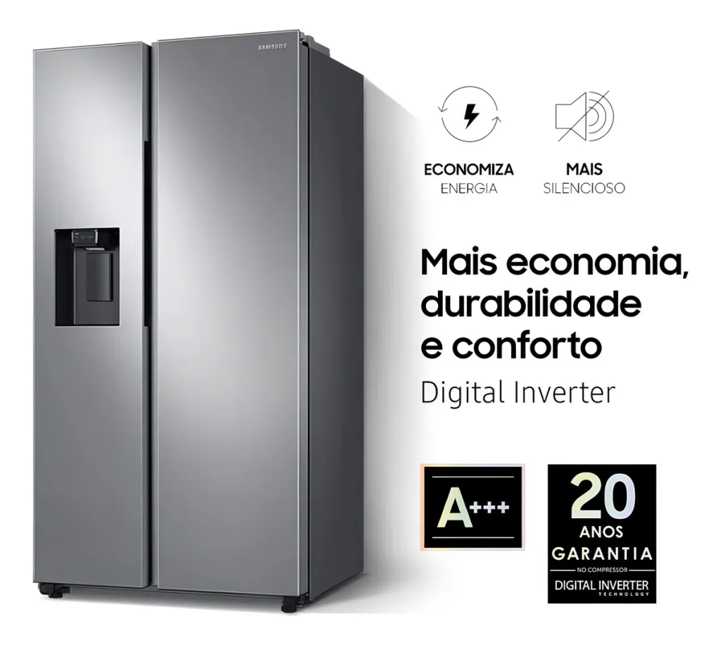 Indicada para famílias grandes, a Samsung RS60 é um modelo side by side que aposta em amplo espaço interno e tecnologias voltadas à estabilidade térmica. O dispenser de água e gelo na porta facilita o uso diário e evita a abertura constante do refrigerador.