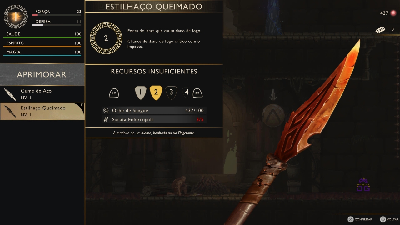 Um pilar fundamental na progressão do jogo reside na lança, arma empunhada por Kratos para despachar os inimigos na jornada. Felizmente, é possível encontrar uma ponta de lança incrivelmente poderosa nas horas iniciais do jogo e que torna boa parte dos desafios iniciais triviais. A ponta de lança em questão é a Estilhaço Queimado.