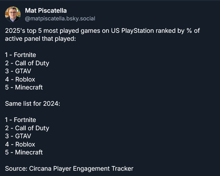Paralelamente, porém, os jogos como serviço estão entre os títulos mais jogados todos os anos, com Fortnite, Call of Duty e Roblox dominando as listas de usuários ativos.