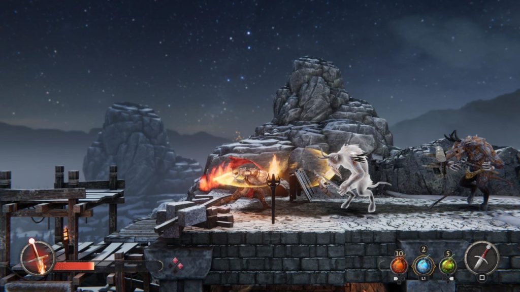 Já em relação ao combate, o jogo vai um pouco além, mas sem inovar muito. Você ataca fraco e forte com alguns tipos de armas (espadas e machados), arremessa bombas e lanças, atira flechas e se defende com um escudo. Porém, todo o moveset é muito básico e não há qualquer tipo de exigência estratégica para lidar com inimigos, mesmo que esteja cercado.