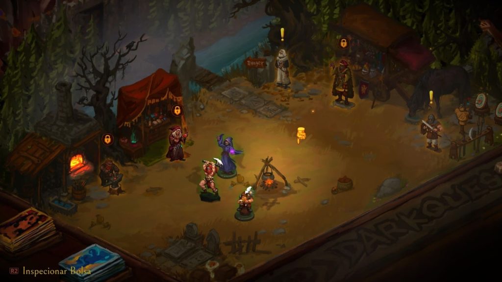 Mesmo com mapas visualmente lineares, há atalhos curtos e portões que levam a pequenas recompensas: moedas extras para o seu bolso, salas secundárias e oportunidades para melhorar seus heróis no acampamento antes da próxima incursão. Portanto, tudo acontece na mesma tela, sem transições, quase como explorar um tabuleiro físico.