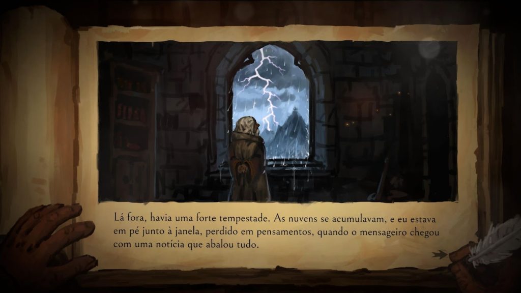 A história se desenvolve em quadros e textos, como um livro de fantasia contando as aventuras do seu grupo, tanto na introdução quanto entre missões. É um estilo simples, mas que funciona para quem gosta de acompanhar a narrativa sem pressa. Vale ressaltar que o game tem localização PT-BR.