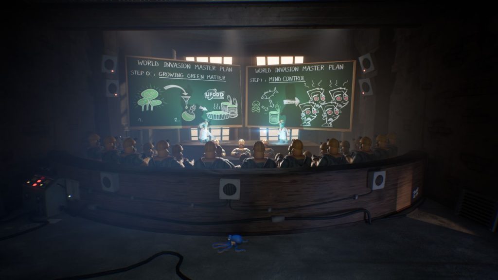 Daí, você aparece em um mega complexo industrial supostamente alienígena. Quer dizer, supostamente não, alienígena mesmo, que pretende te transformar em comida pra uma grande rede de alimentos marinhos. Então não resta outra opção: o polvo precisa escapar de lá com vida, enquanto é perseguido por ratos, cozinheiros, captores, peixes gigantes e ate mesmo uma gaivota maluca.
