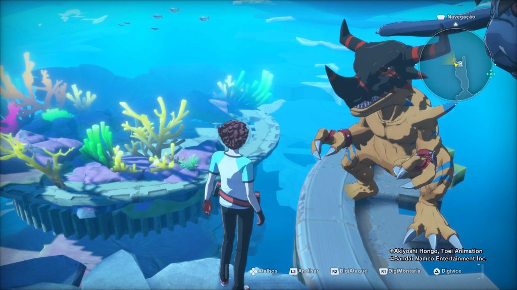 Temos diversos mapas para explorar, desde as cidades principais no mundo humano e no mundo digital até florestas, praias e regiões aquáticas dentro do mundo digital. Infelizmente, cada mapa é dividido em espécies de “corredores”, o que limita um pouco a liberdade de exploração. Apesar disso, não senti que essa limitação comprometeu a experiência de gameplay.