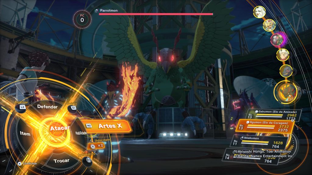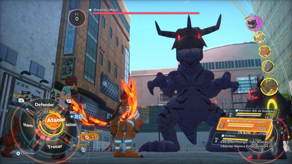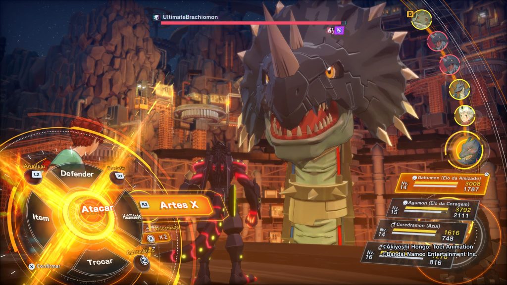O protagonista também não fica apenas dando ordens. Conforme subimos seu nível, desbloqueamos habilidades especiais, que permitem, por exemplo, aumentar temporariamente o poder dos Digimon aliados ou até lançar um ataque poderoso diretamente contra os inimigos.