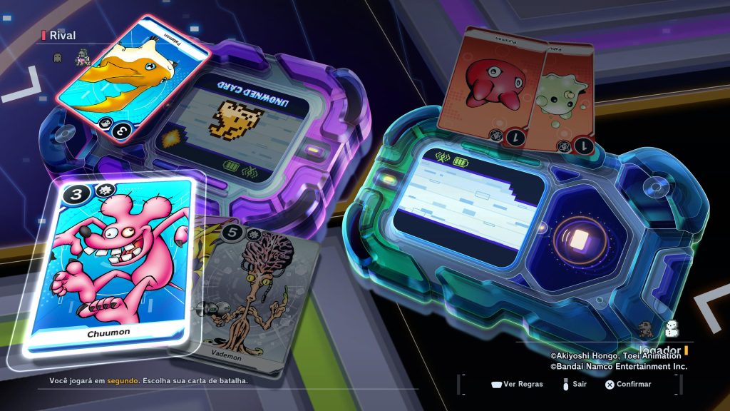 Além das batalhas por turnos, temos também um jogo de cartas bem divertido, os quais cada carta representa um Digimon específico, possui um nível de poder e também é referenciada pelo três tipos dos monstrinhos. Nosso objetivo é derrotar o maior número de cartas do oponente, jogando uma por vez.