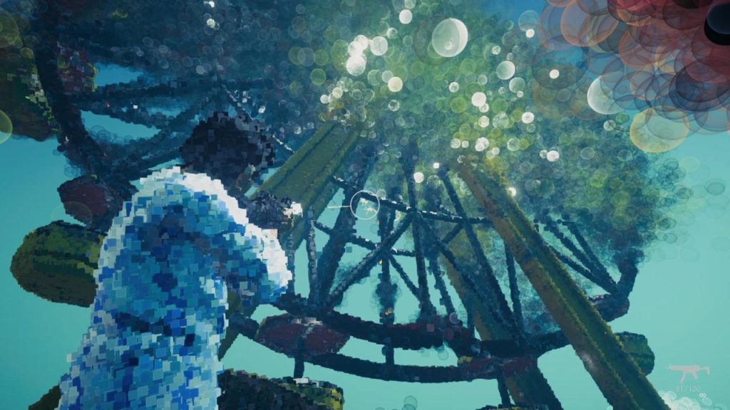 Já os projéteis são limitados, mas com muitas aspas — coletar itens no mapa permite trocá-los por mais arremessáveis com um NPC. Armas de fogo, por exemplo, vão limpando os cenários de forma gradual, enquanto projéteis como granadas e um lança-foguetes abrem grandes áreas (quase mapas inteiros, em alguns casos). Isso funciona muito bem para a ideia de Dreams of Another, conversando tanto com a proposta de “sonhos embaçados” quanto com a narrativa do homem que não conseguia atirar.