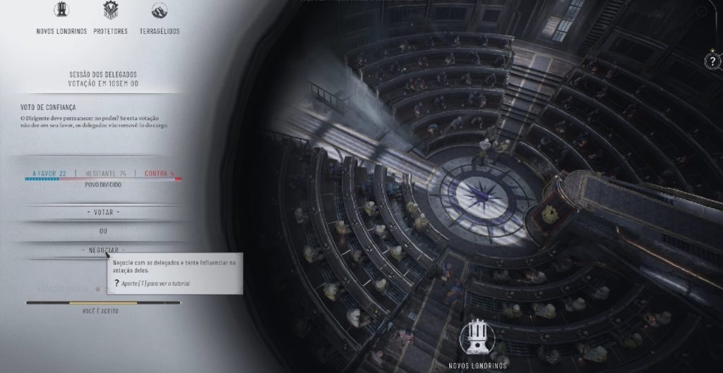 Quando a cidade cresce, o jogo força você a sacrificar pureza ideológica em prol de resultados. É aqui que o texto e a montagem sonora deixam tudo mais dramático: avisos de crise, murmúrios do Conselho e a trilha que cresce nas votações críticas criam um senso de espetáculo raro no gênero e sustentam o peso de decisões que não têm a resposta “perfeita”.