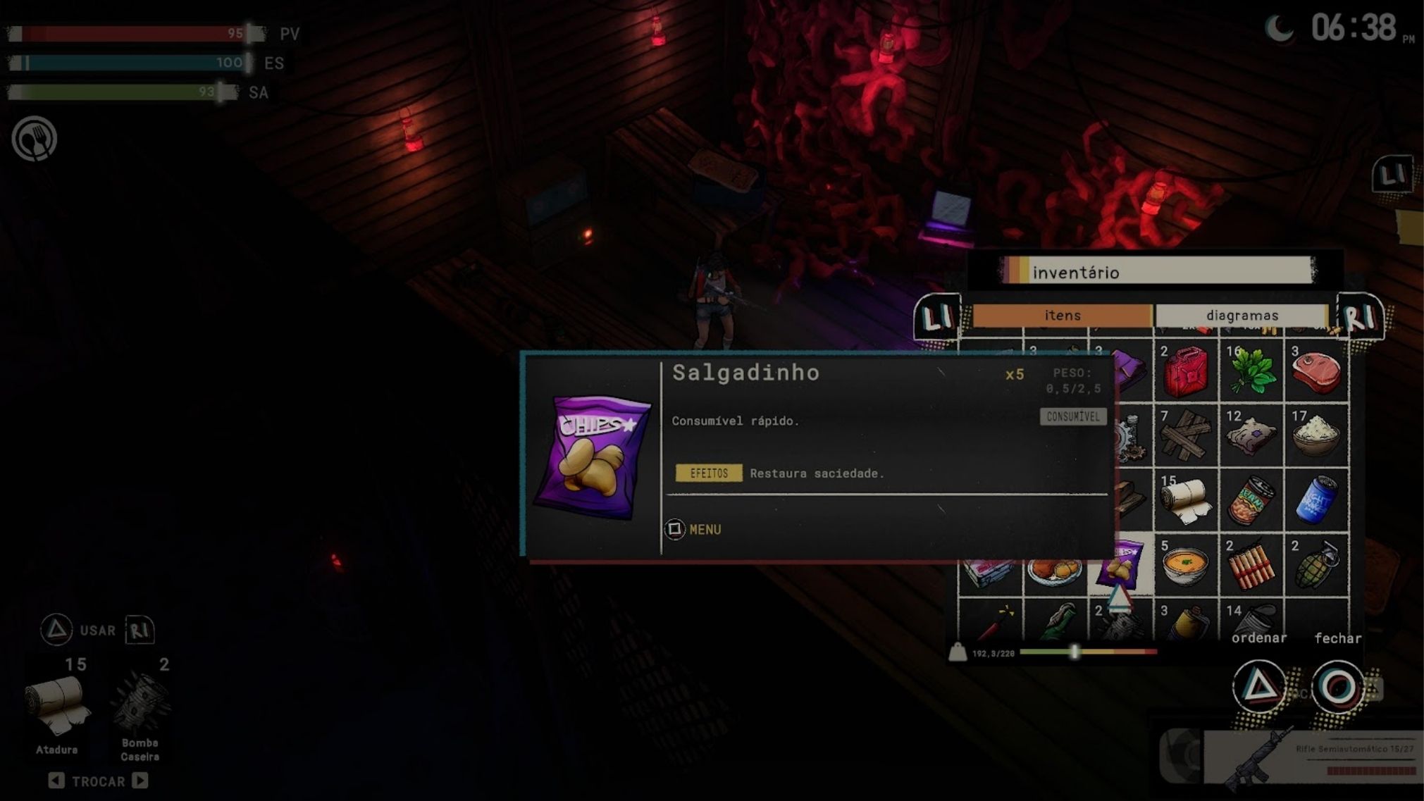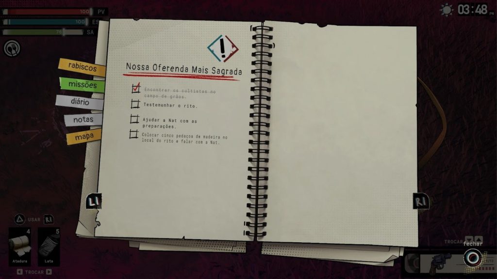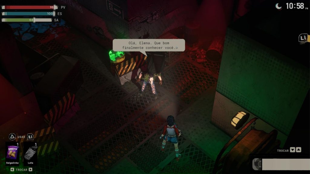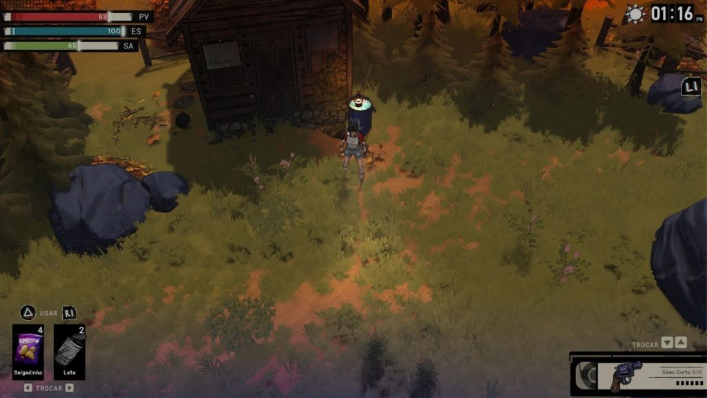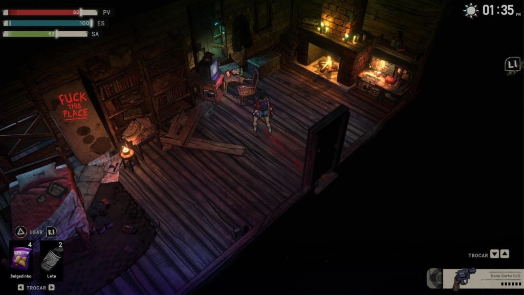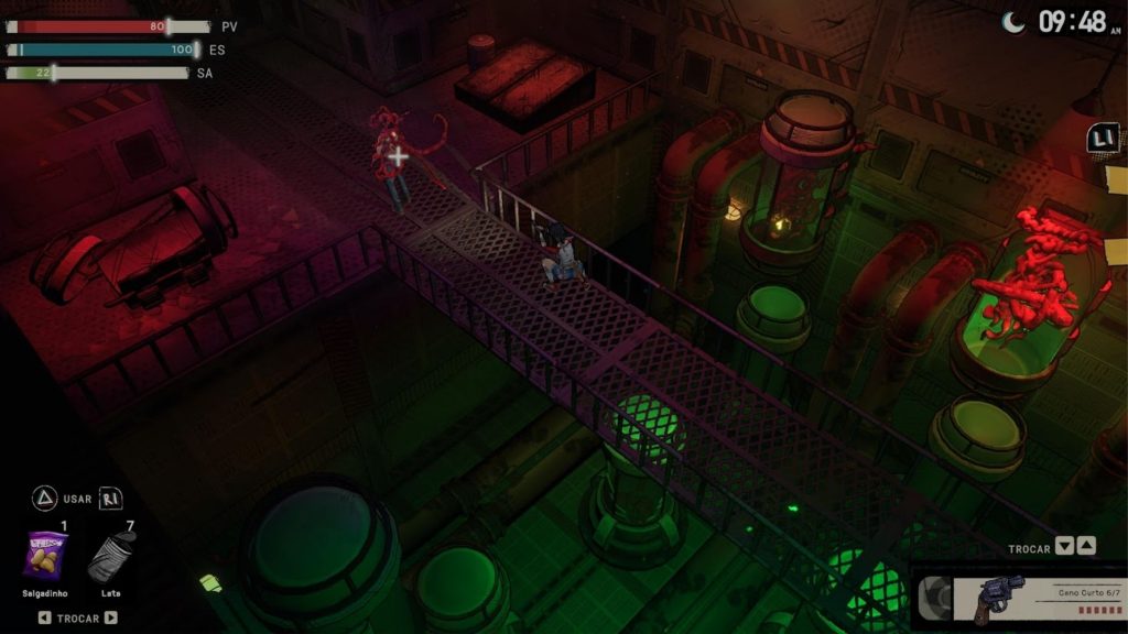 Essa última exige muita atenção, já que a personagem precisa se alimentar para evitar penalidades como lentidão e perda de eficiência. É um sistema que, no papel, adiciona uma camada extra de gerenciamento e reforça a proposta de sobrevivência.