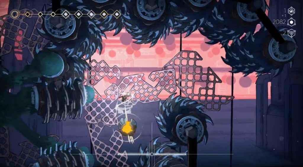 Já o escudo diz respeito à vida de MIO. Ela começa com poucos, mas aprimora à medida que compra capacidade e se fortalece pelos modificadores. Basicamente esse sistema consiste em golpes que a robô leva: toma um golpe, perde um escudo. Ah, e sem a possibilidade de recuperar. Não existe frasco no jogo ou ação que reverta a perda de uma vida.
