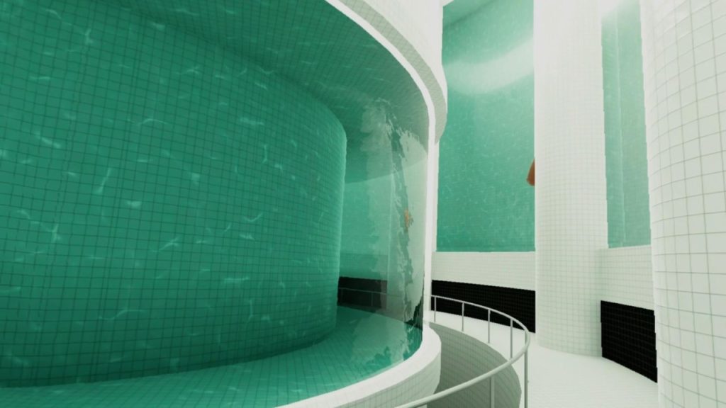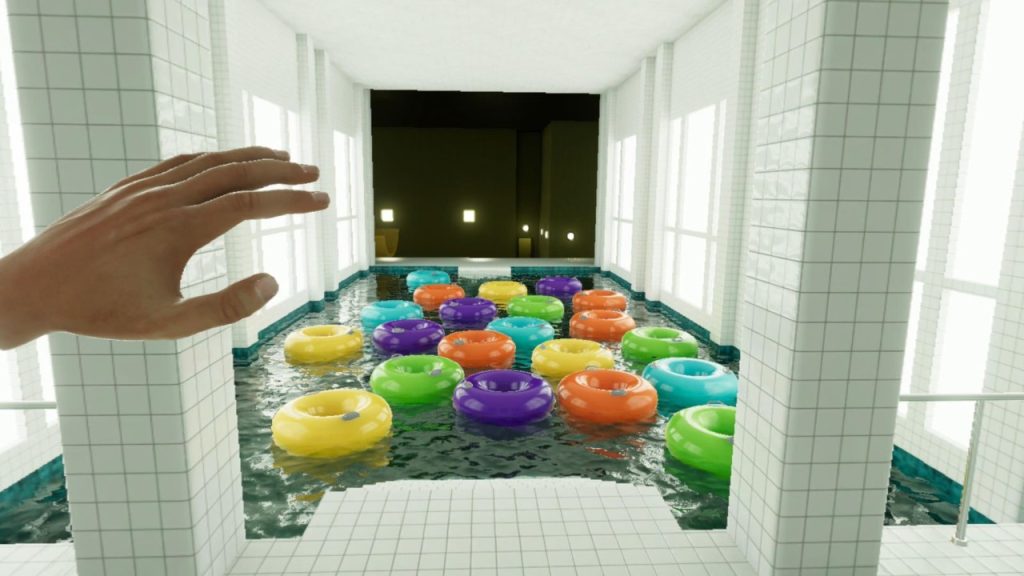Pools parece muito com um sonho. Tudo criado dentro do jogo se aproxima consideravelmente do surrealismo, intercalando piscinas de todos os formatos e tamanhos, tobogãs, escorregadores, boias e outras estruturas que costumam passar a impressão de segurança e familiaridade.