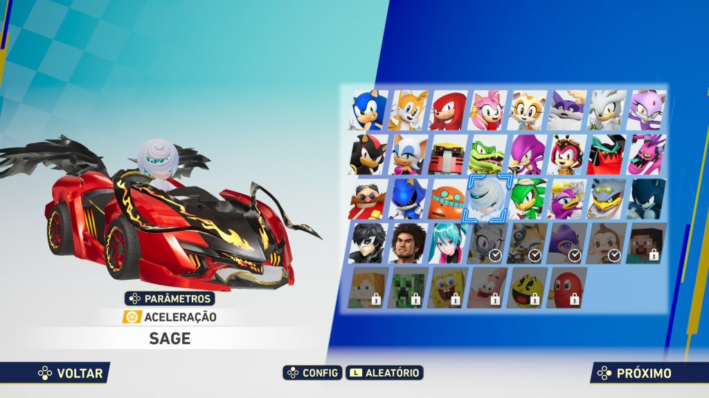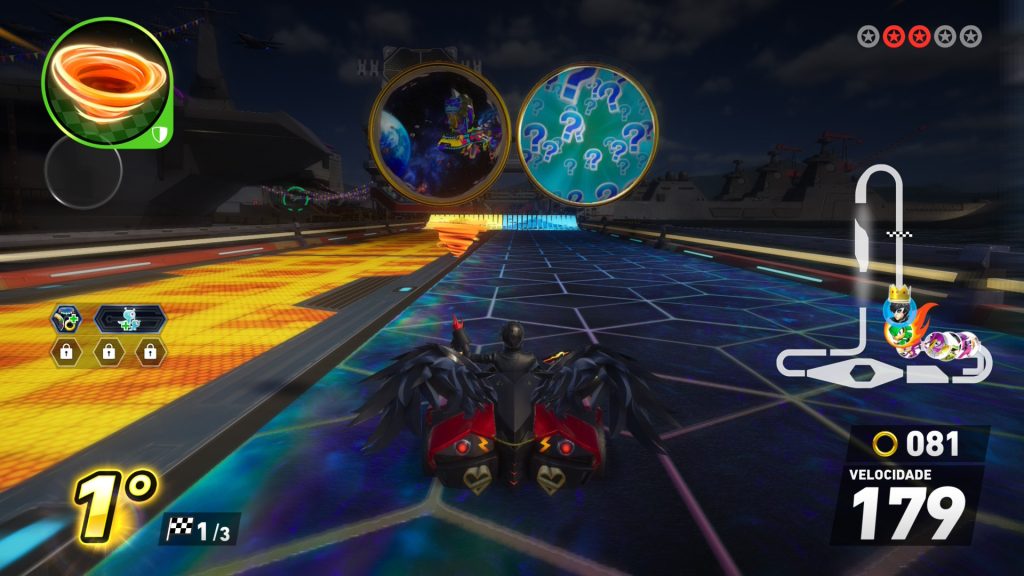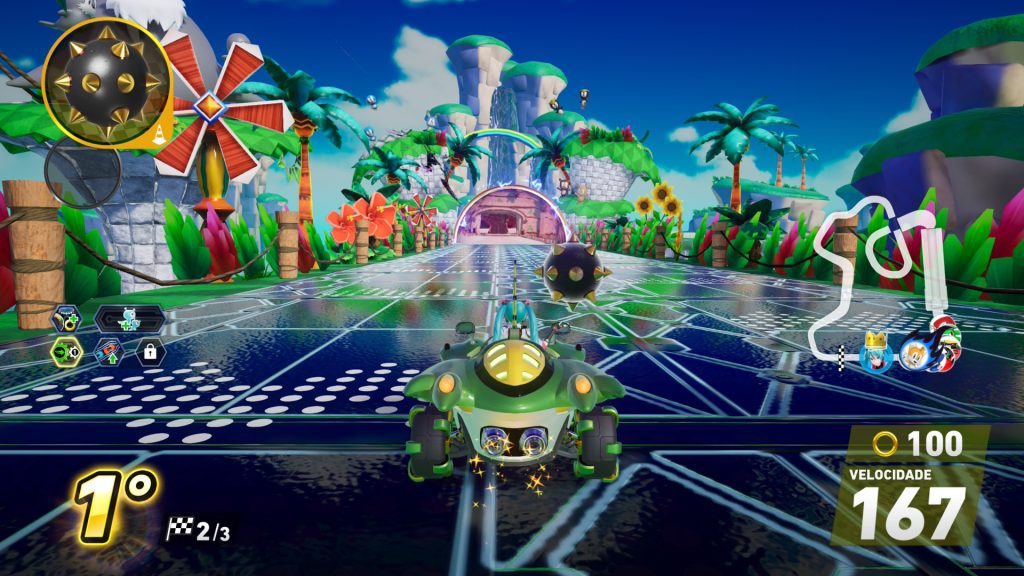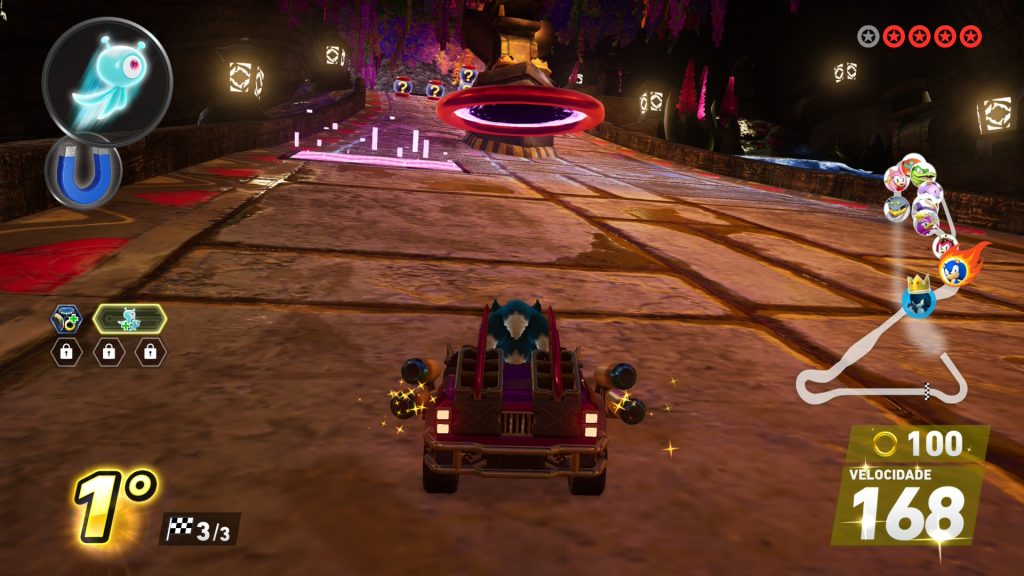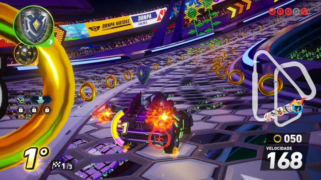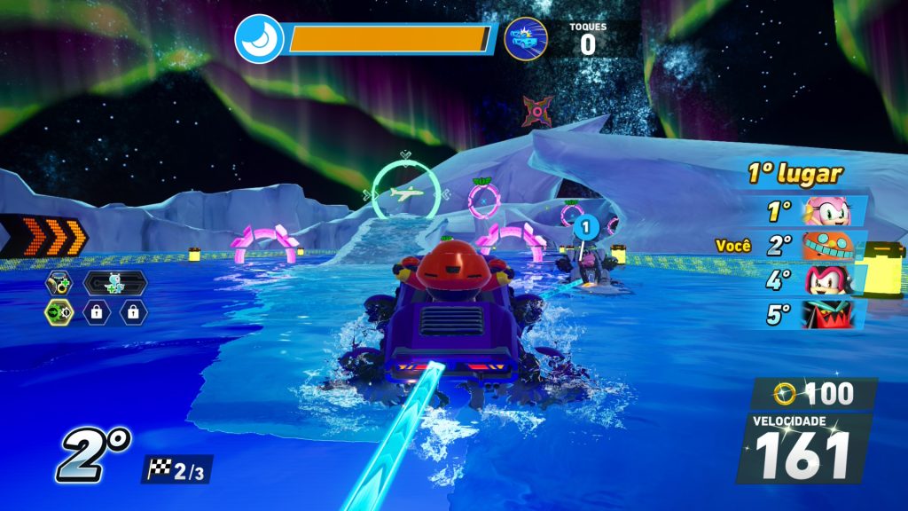 Além desses aspectos técnicos, vale ressaltar que o jogo está disponível em português do Brasil. Aqui, contudo, preciso destacar algo que me incomoda com a direção de localização de Sonic: alguns termos continuam em inglês, incluindo nomes de pistas e veículos. Não mencionei antes, mas os controles no modo aquático também me incomodam um pouco, pois o turbo funciona de uma maneira diferente do convencional, mas isso não é nada com o qual não dê para se acostumar com o tempo.