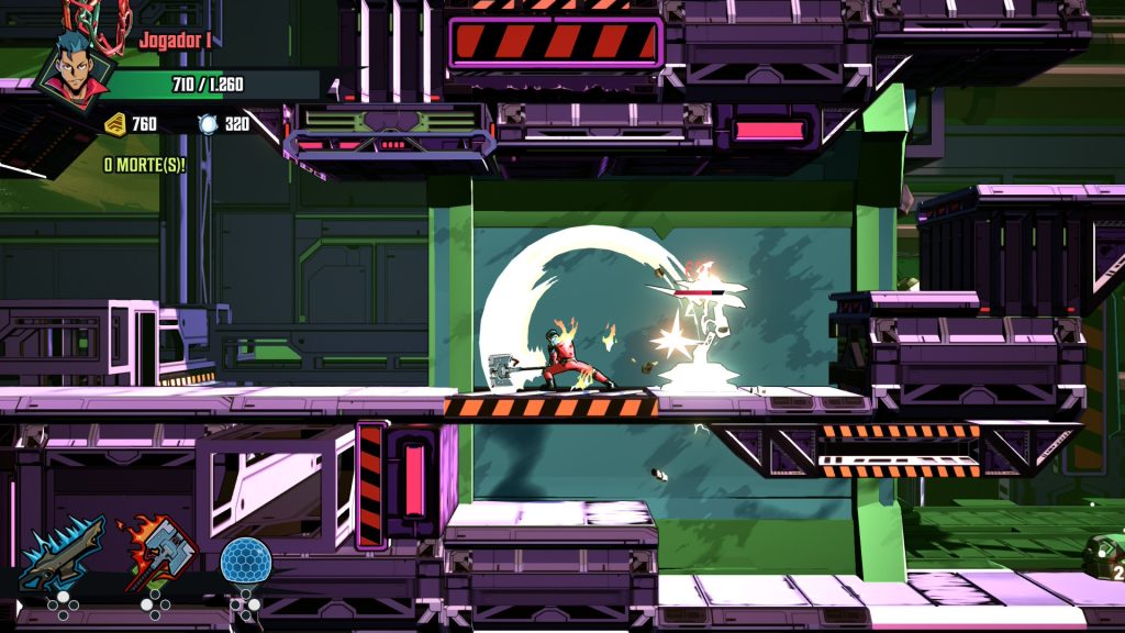 Para além dos aspectos multiplayer, contudo, Storm Lancers traz alguns problemas que atingem o jogo como um todo. O primeiro deles está ligado às mecânicas de plataforma do jogo, que são pouco responsivas, principalmente no início da jogatina. É difícil explicar exatamente como esses problemas se dão, mas em diversos momentos, parece que o personagem não “encaixa” no canto das plataformas, mesmo quando você tem altura o suficiente para atingi-las. Esse problema diminui conforme você avança e liberar poderes permanentes, como o pulo duplo, mas toda a mecânica de plataforma nunca deixa de ser um pouco desengonçada.